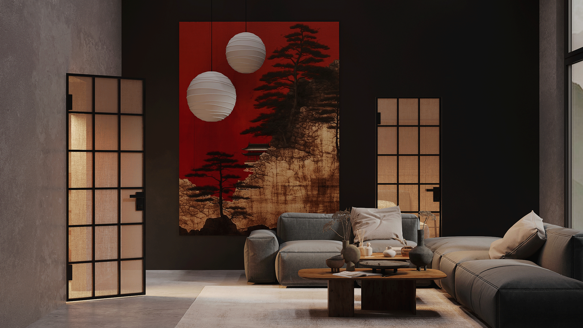 Тип 1: Межкомнатная перегородка имеет неподвижные части — это полотна, которые фиксируются в проем и в потолок. Подвижные полотна в этом случае заезжают за них. Возможна комплектация механизмами синхро или доводчиками.