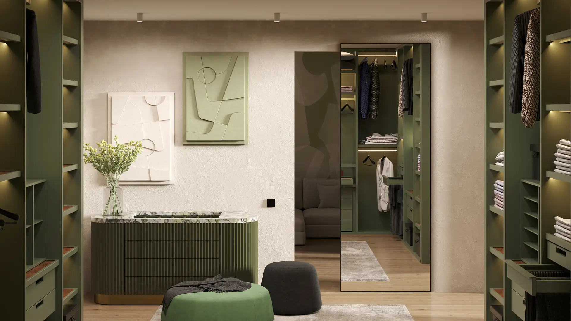 Функциональное преимущество: все подвижные механизмы скрыты внутри конструкции дверного полотна, на полу нет направляющих, что улучшает эстетическое восприятие и создает его визуальную целостность. Может использоваться как зеркало в полный рост.
